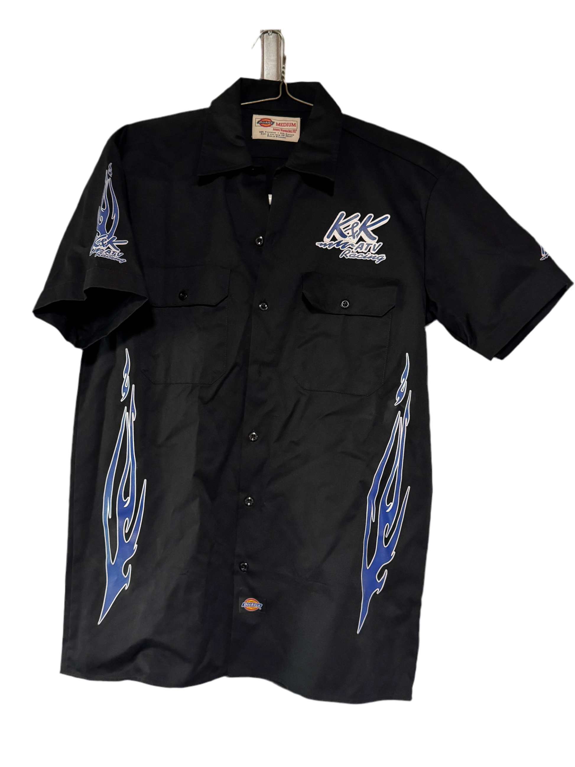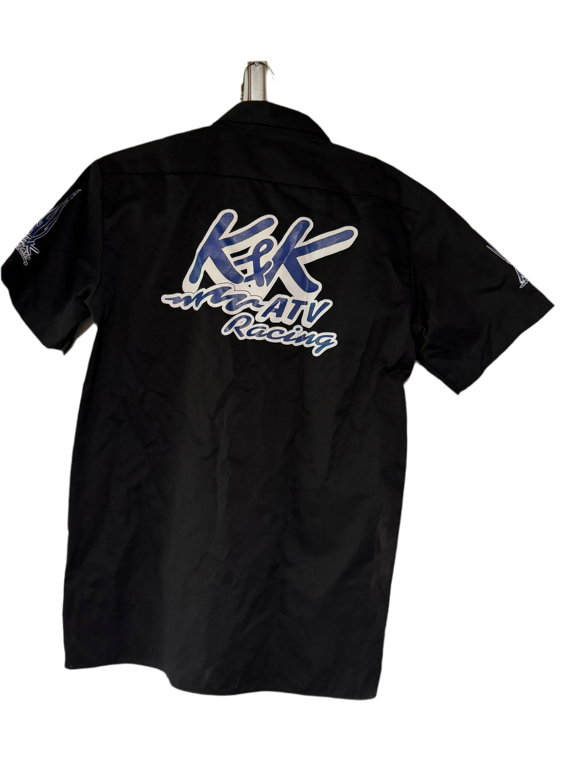 Fuel your look with this K&K ATV Button Down Pit Shirt — a sleek black work shirt featuring bold blue graphics and logos that pop against a crisp white backdrop. Perfect to wear in the garage and in the pit. $35 +Shipping $5